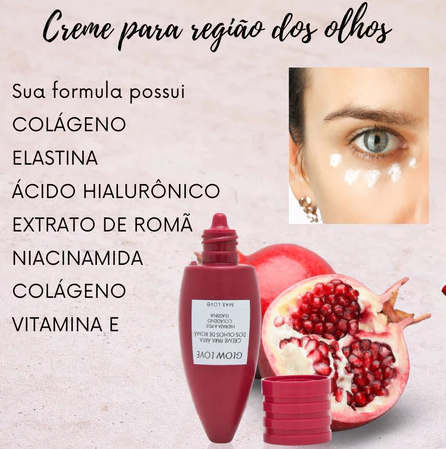 O Creme para Área dos Olhos Romã Glow Love da Max Love sua fórmula com colágeno e elastina ajuda a reforçar a elasticidade da pele, suavizando olheiras, a romã, rica em antioxidantes, revitaliza e hidrata, proporcionando um olhar mais iluminado.